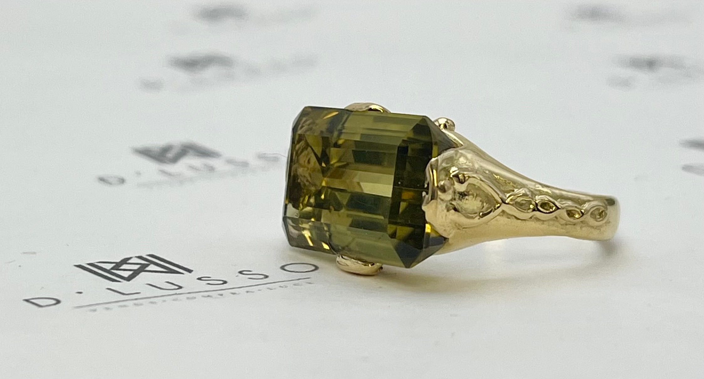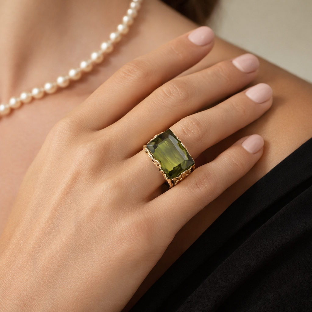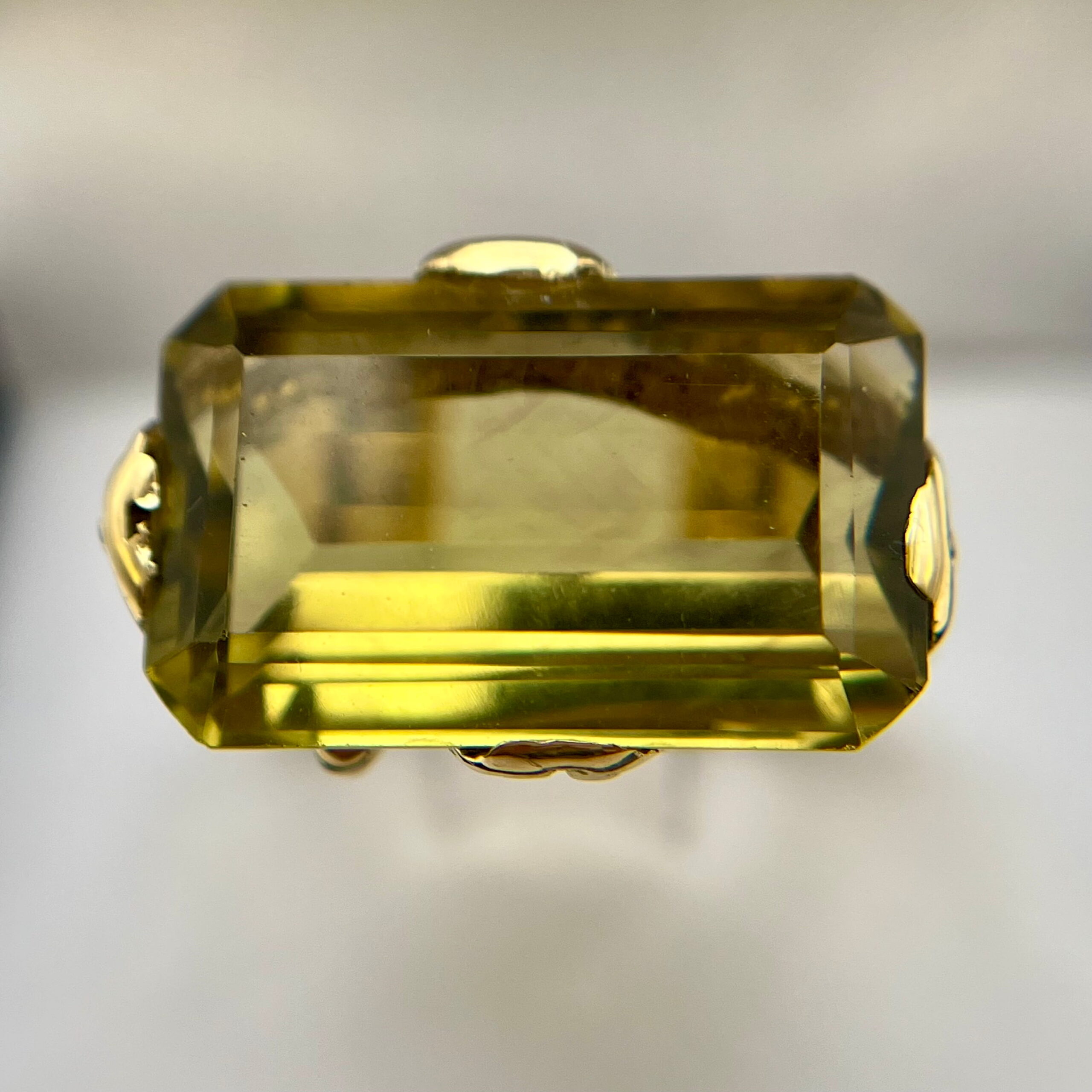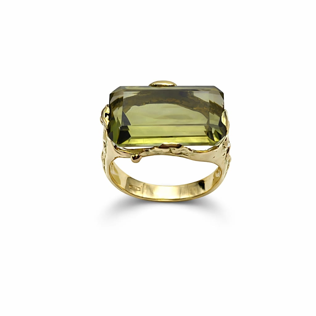 - 1 cuarzo natural, variedad Prasiolita, de 14,11 cts. aprox., corte Esmeralda – octogonal, color verde.