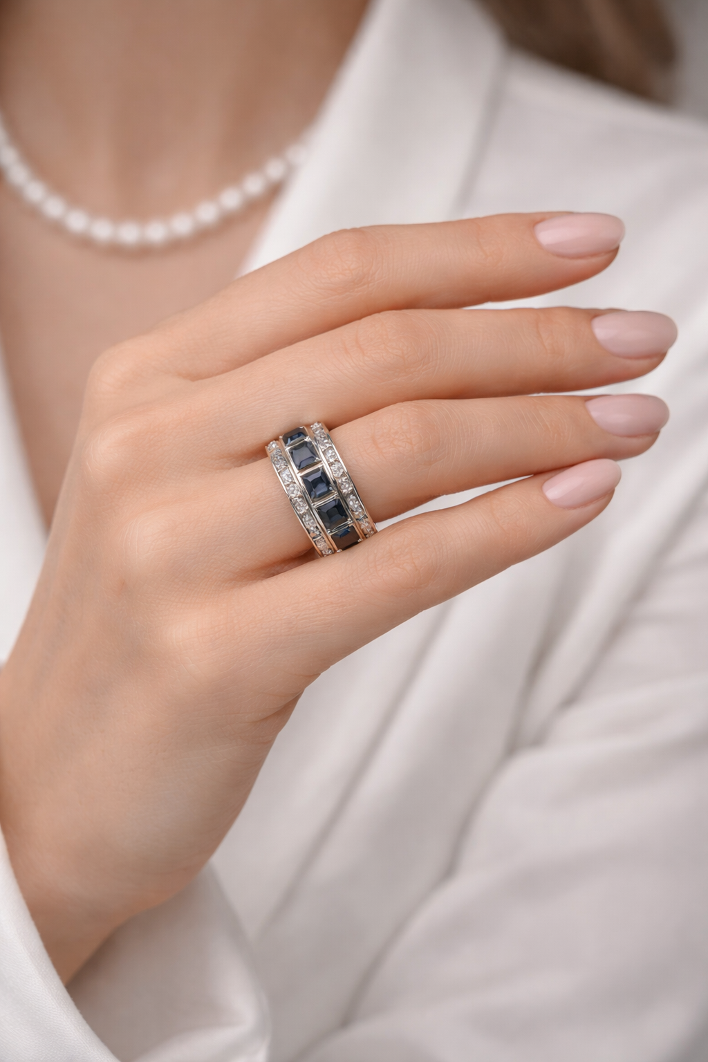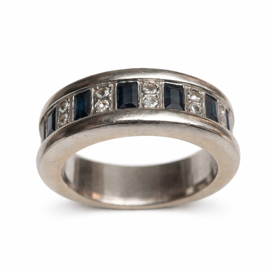 • 5 zafiros naturales que totalizan 0,85 cts. aprox., corte Baguette/rectangular, color azul.