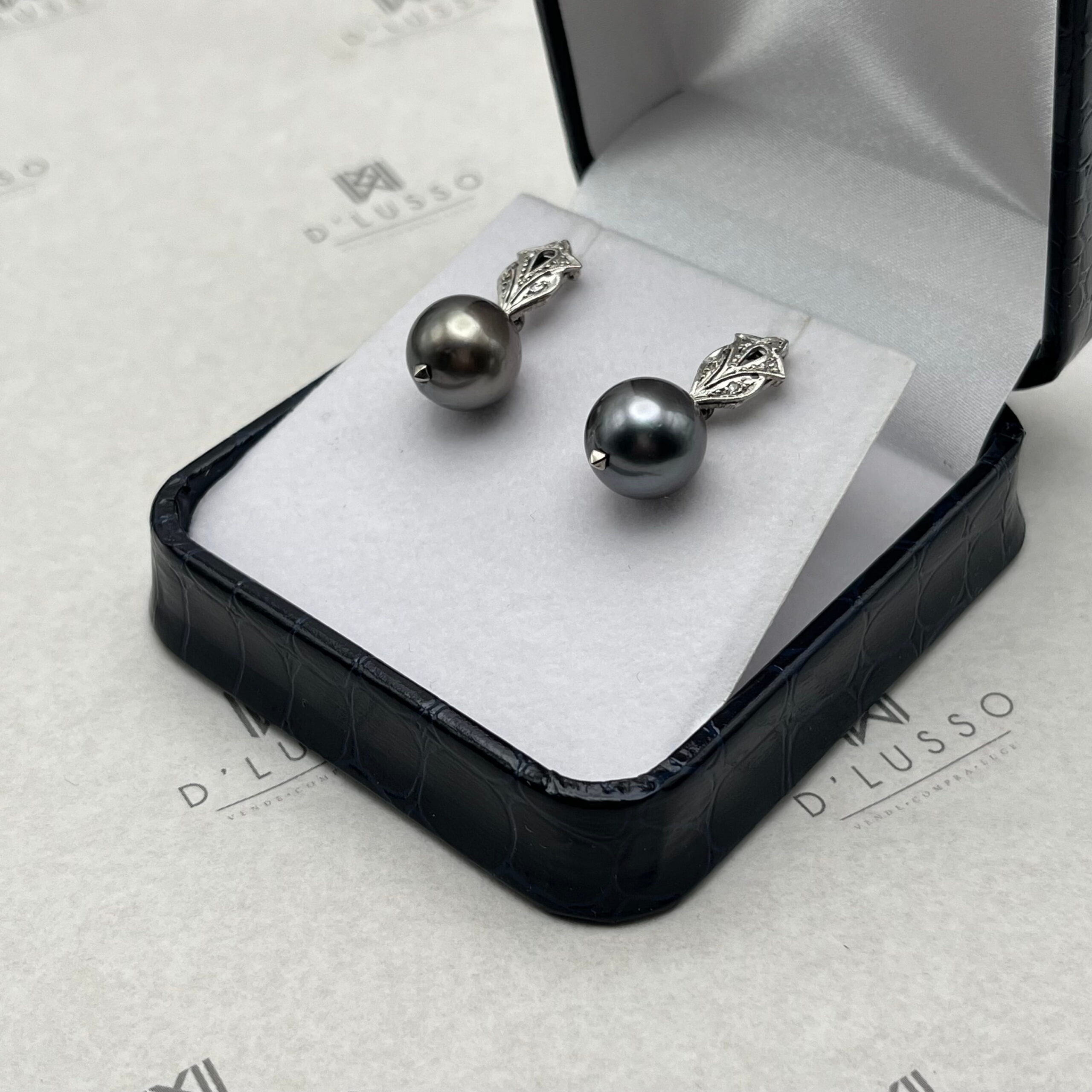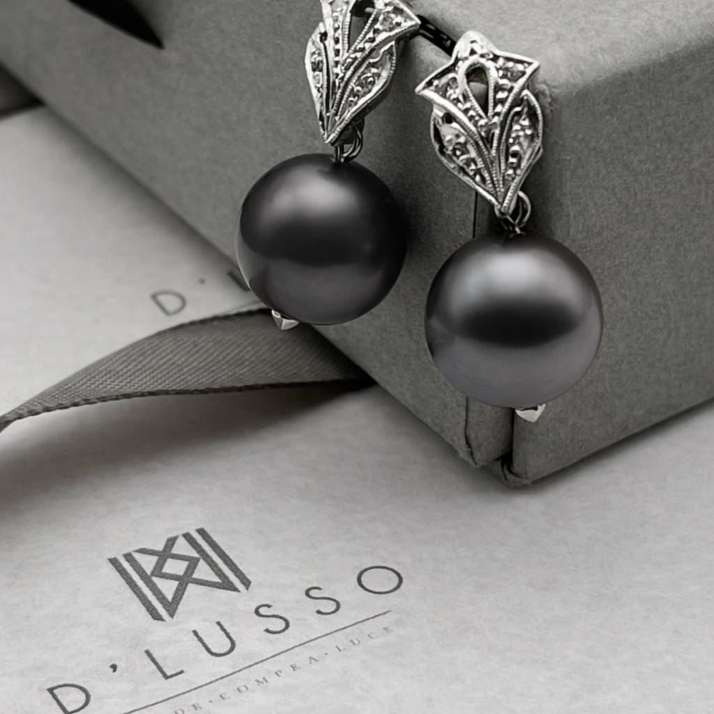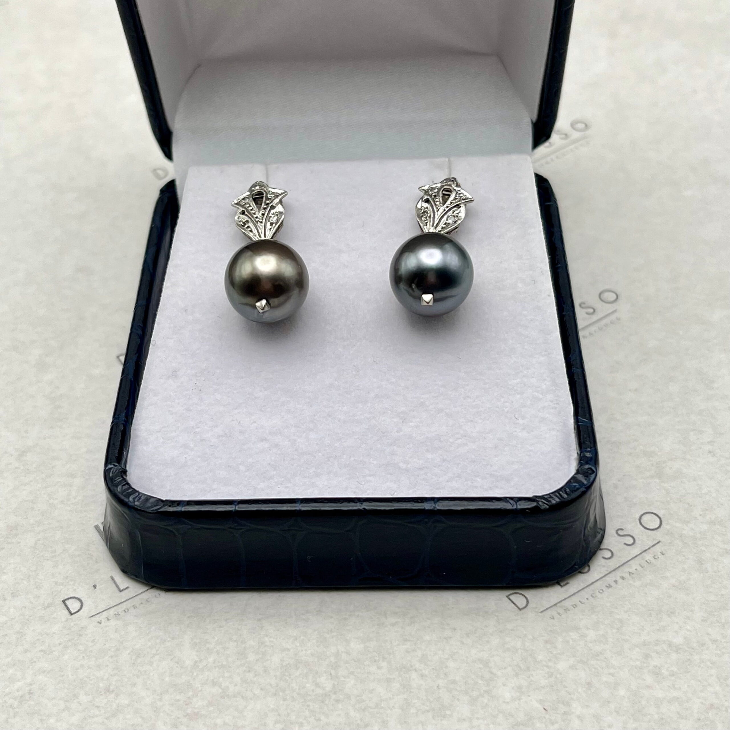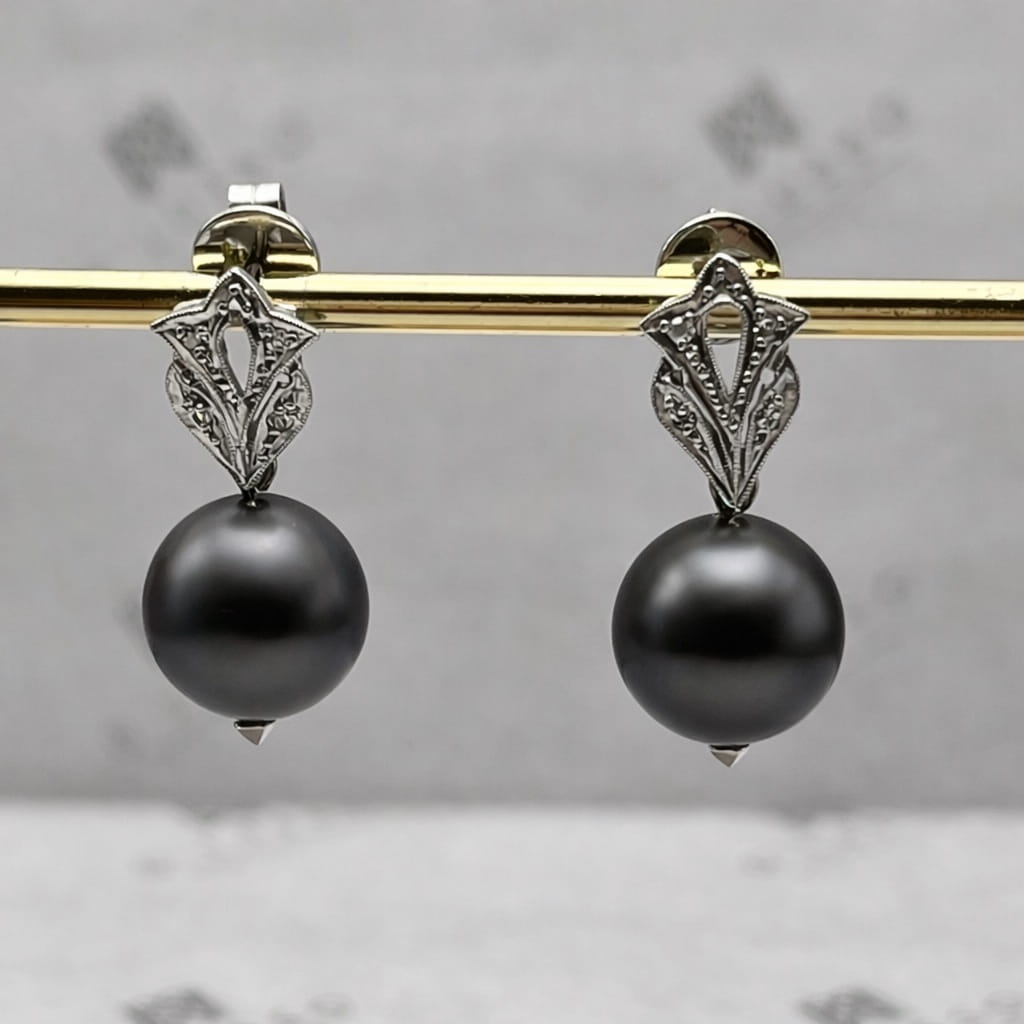 • 2 perlas cultivadas, variedad Tahiti de 11 – 11,5 mm, color café sobre tono gris.