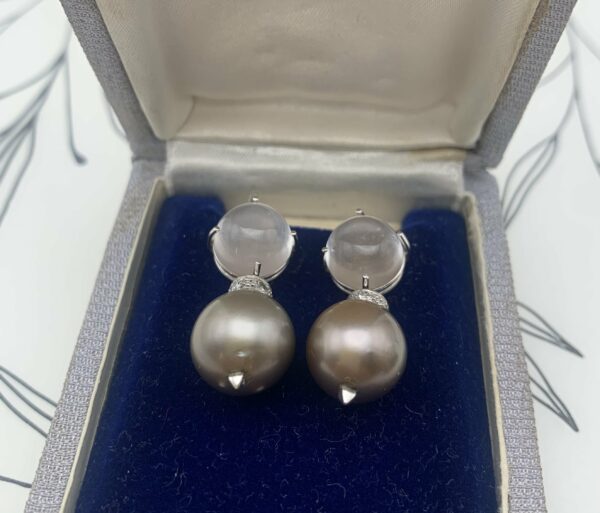 - 2 Feldespato (Piedra luna), variedad Adularia que totalizan 8,0 cts. aprox., corte cabouchon redondo, color blanco.