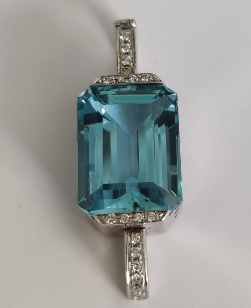 Colgante de oro blanco 18K de 15,7 gr. Contiene un aguamarina, corte esmeralda, de 23,50 cts, muy antigua y rara en color y tamaño, además de 18 brillantes naturales de 0,42 cts aprox, pureza VS/SI, color G/H.